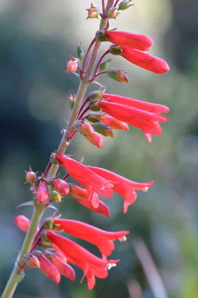 Firecracker penstemon and scarlet bugler are two red penstemon species that look very similar to one another. Firecracker penstemon grows from the Rocky Mountains to California, but only in the California deserts. Scarlet bugler grows all across the southern California coast and coastal ranges. These two penstemons are excellent attractors for hummingbirds.